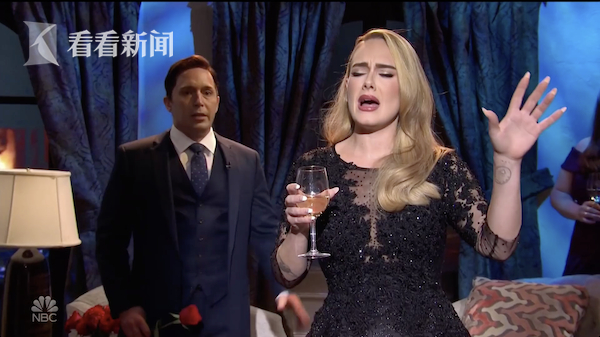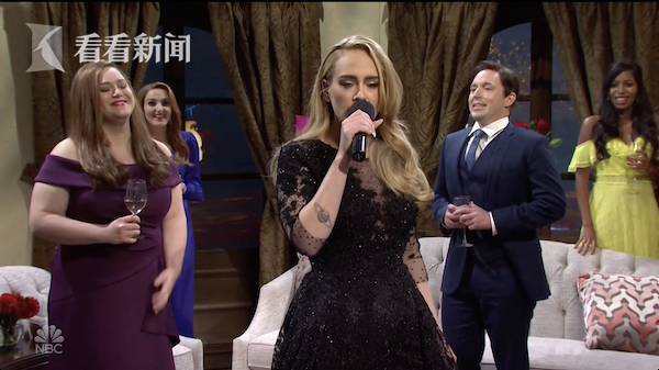 最近,阿黛尔跨界当起了主持,在美国特别火的节目《周六夜现场》上,她重返舞台展现了自己的主持首秀,这也是三年之后重返舞台进行表演,她身旁还有美国女歌手H.E.R和常驻嘉宾、演员凯特·迈克金农。
