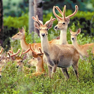 海南坡鹿生活在海南省西南部地区,是国家一级保护野生动物。海南坡鹿体型似梅花鹿,但身上没有梅花图案,背部呈现自然的褐色,躯体和四肢都比梅花鹿更显细长。海南坡鹿最有特色的是雄鹿头上的犄角,除主干外还有一个较大的眉杈,主干与眉杈接连起来,像一个不完全的圆弧。