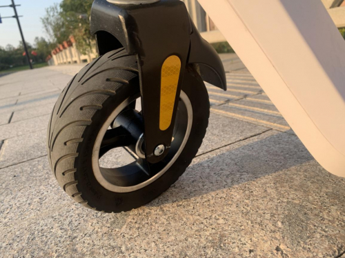 第四,前驱波纹圈减震,轮胎内置气孔减震,减少车身颠簸,抗震性强,ES500的轮胎具有很好的避震效果,经过不同路段的通行测试,甚至于碎石路面,没有明显的震感,骑行体验真的不错哦。