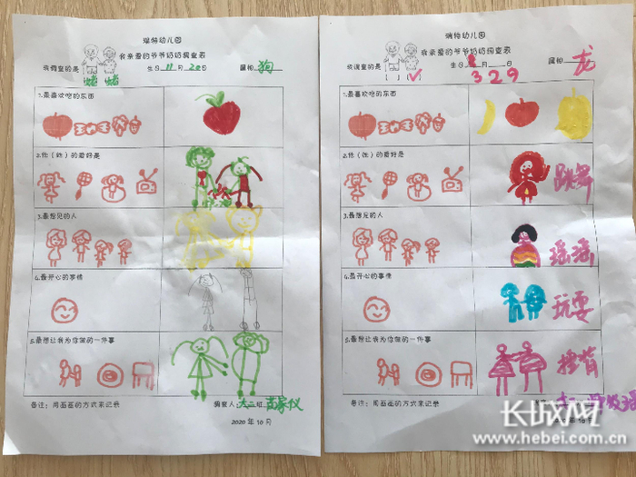 在石家庄市第一幼儿园,还不会写字的小朋友们用自己的方式交回了一张《我的爷爷奶奶》调查表。“我的奶奶生日在3月29日,最喜欢吃苹果、香蕉和菠萝……”一张张充满童真童趣的五颜六色的调查表,背后是学校的良苦用心。“通过调查自己的爷爷奶奶的属相、喜好,以此让小朋友们更好地了解他们,关心他们。”