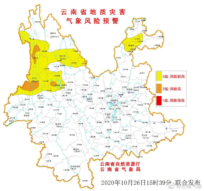 2020年10月26日20:00~10月27日20:00, 怒江、大理及保山部分地区发生滑坡泥石流的风险高;怒江、迪庆、丽江、大理、德宏、保山及临沧部分地区发生滑坡泥石流的风险较高。