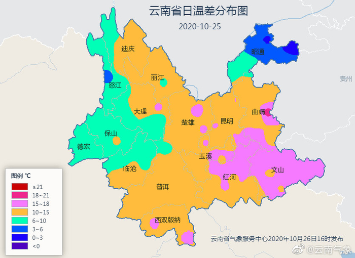 25日云南日温差分布图