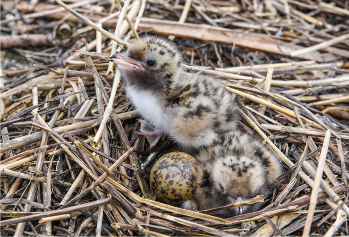 盐城黄海湿地麋鹿保护区的一处小岛,两只出生不久的普通燕鸥幼鸟在巢穴中(李博/摄)