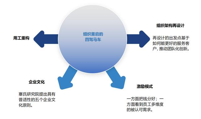 以上就是组织重启的四驾马车,从用工模式,到组织架构再设计,到企业文化再到激励模式。"