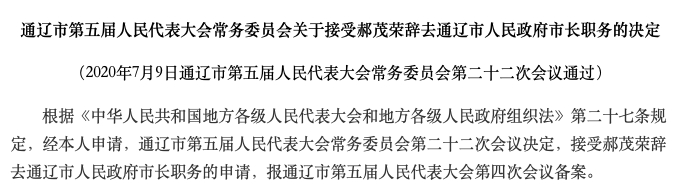 担任通辽市市长3年后,今年7月,郝茂荣辞去通辽市人民政府市长职务。
