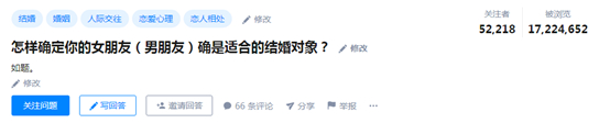 知乎上有个话题:怎样确定你的女朋友(男朋友)是适合的结婚对象?阅览1700w+,关注5w人,一共有1956个回答。