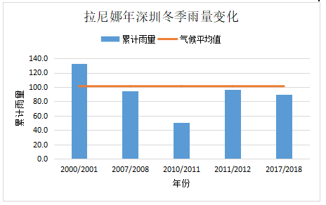 从2000年以来发生的5次拉尼娜事件的年份的气象数据来看,在拉尼娜年的冬季(12月-次年2月),深圳的气温较常年同期低0.3℃,出现寒冷日数(日最低气温≤10℃)平均21天,比气候值多3天。降雨方面,拉尼娜年深圳冬季的降雨较常年偏少9%。平均干燥日数(日最小相对湿度≤50%)44天,较常年多6天。