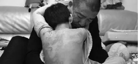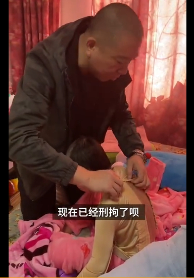 孩子在亲爸怀里,后背上伤痕累累