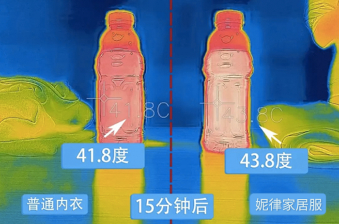 普通保暖衣包裹的水瓶温度只有41.8℃,而妮律包裹的水瓶温度有43.8℃,保暖能力更好。