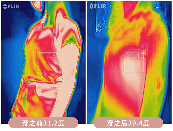 没穿之前温度是31.9℃,穿上5分钟后,测试之后温度变成了39.2℃,体感温度上升了8℃。