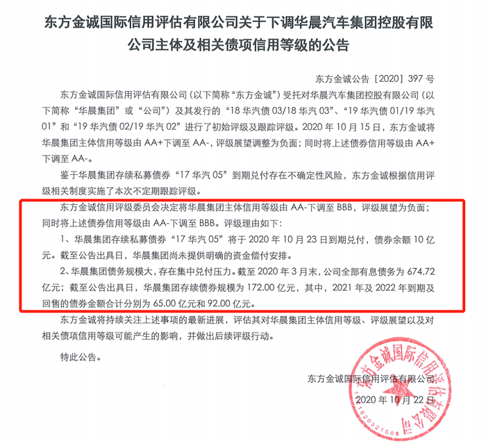 8月,评级机构大公国际和东方金诚先后将华晨集团及多只债券列入评级观察名单;9月,东方金诚和大公国际先后调低了对华晨集团主体的信用评级;10月,东方金诚和大公国际再度下调对华晨集团的评级,其中,东方金诚将华晨集团的债券评级从年初的AAA下调至BBB。