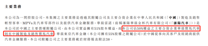 从业务体系上,华晨中国承载了华晨集团旗下五大品牌:中华、金杯、华颂、雷诺以及华晨宝马的整车生产、研发等业务。其中,华晨宝马品牌主要来自于华晨中国与宝马(荷兰)控股有限公司成立的合资企业,其中华晨中国持股50%。