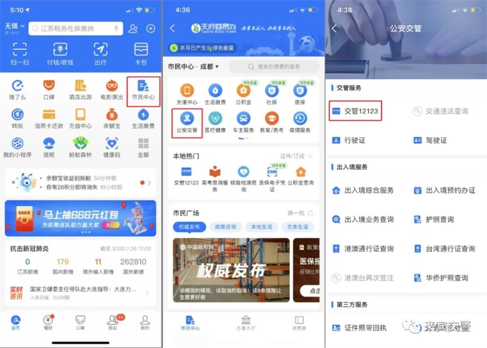 打开支付宝,可从首页→市民中心→公安交管专区,找到并进入“交管12123”小程序。