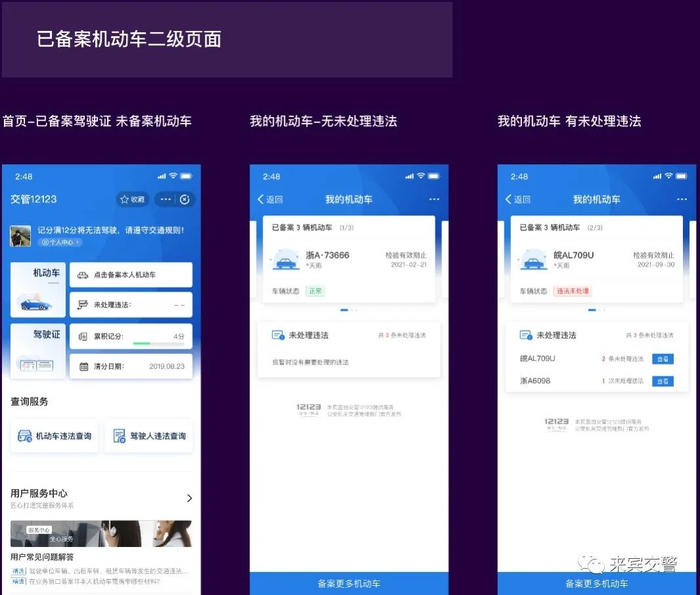 首页机动车信息区域,包含“备案车辆”和“未处理违法”两项功能,根据用户机动车备案情况动态展示。