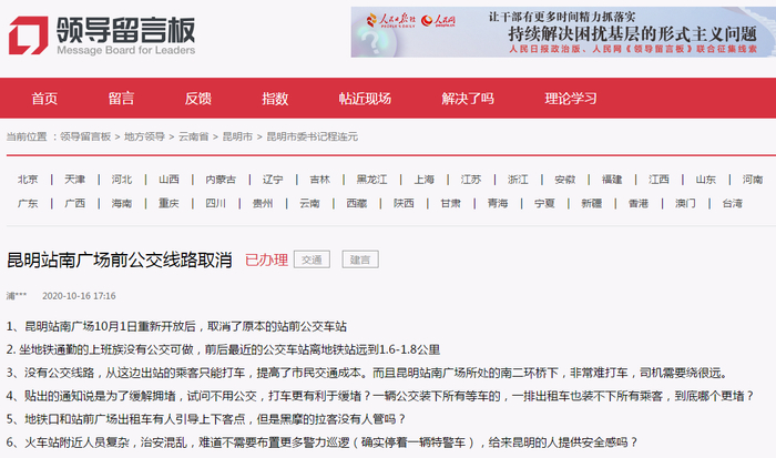 10网友人民网领导留言板留言:昆明站南广场公交车站取消了?官方回复来了