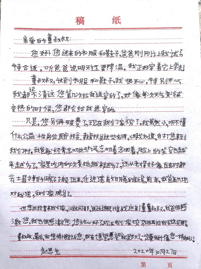 赵恩光回家后看到衣服和鞋子,既高兴,又感慨。原来,自从2015年董会升来到西张茹村,赵恩光家里几乎一天一个变化。先是灯更亮堂了,之后家里又有了电风扇等电器,后来,他妈妈享受了医疗扶贫,看病的钱有了着落,他自己也因为教育扶贫,给家里省了一笔开支……再后来,全家还住进了明亮的新房子。董会升待他更是跟亲侄子一般,一到换季的时候,便给他买新衣服、新鞋。