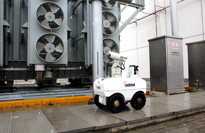 10月27日,宁夏电力检修公司员工使用智能巡检机器人雪天特巡750千伏六盘山变电站一次设备。(罗琳)