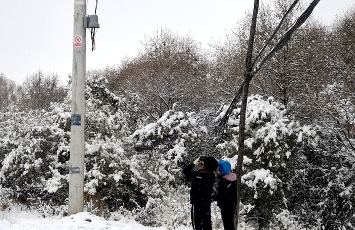 10月27日,青海黄化化隆供电公司员工韩伟荣、林海云雪后特巡10千伏加五线4~21号杆。(王春霞)