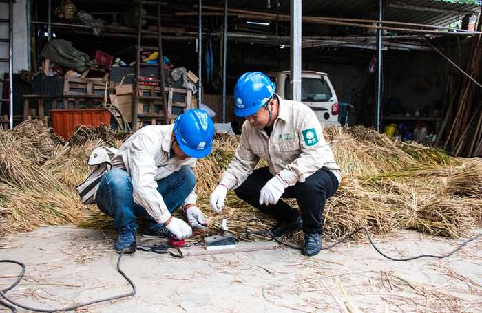 10月28日,江苏泰州靖江供电公司孤山供电所员工刘鹏飞、刘灿宏在孤山镇联华村4组为村民陆筛章检查电动脱粒设备。(汪红清)