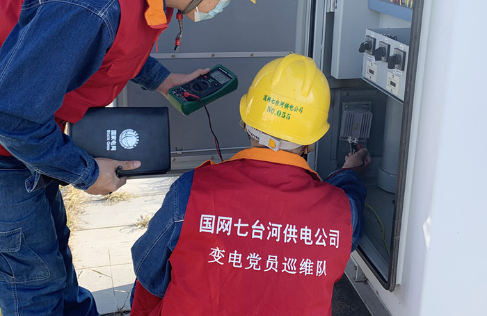 10月27日,黑龙江七台河供电公司员工刘文杰、田雨生在220千伏新民变电站检查机构箱发热情况。(梁宇 张洪新)