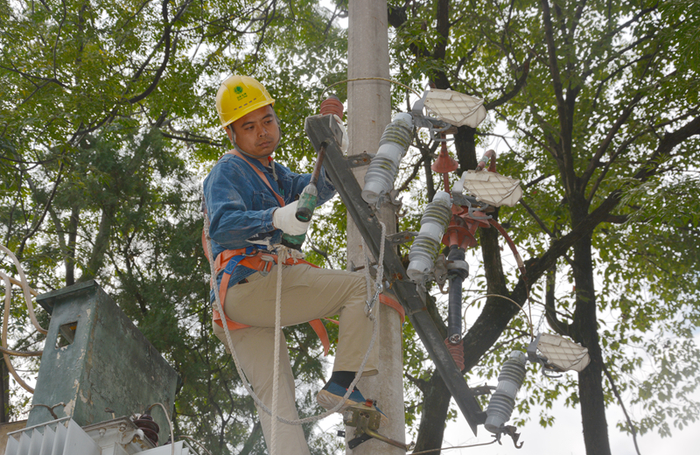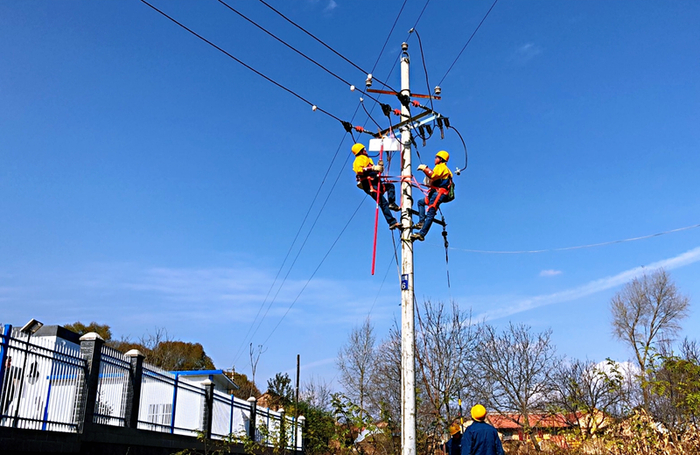 10月26日,河北雄安新区雄县供电公司员工在220千伏雄州变电站10千伏马庄线玉鑫支线5号杆上带电接引流线。(周龙 赵菲)