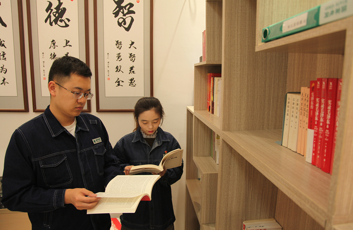 10月28日,河南濮阳清丰供电公司员工胡亚飞、吴晓茹在职工书屋借阅专业书籍。(卢沛)