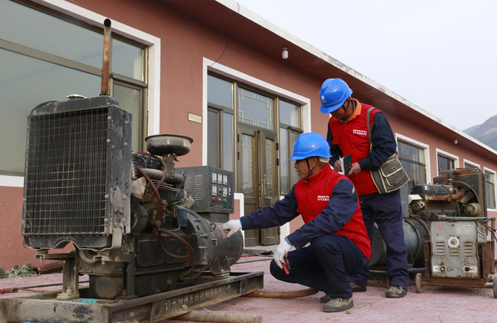 10月28日,辽宁葫芦岛供电公司员工刘辉、李德余在建昌县头道营子乡鑫淼家庭农场为客户检查自用发电机。(李娇 范明)