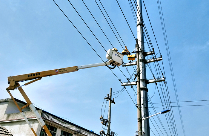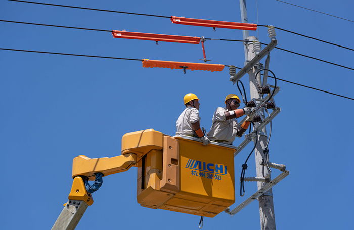10月27日,江苏南通启东供电公司员工在10千伏惠和线17号杆用绝缘杆作业法开展带电检修作业。(茅锴杰)