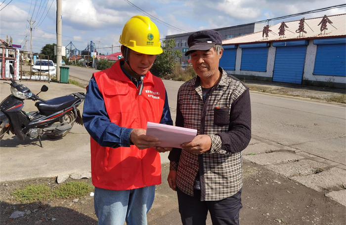 10月27日,吉林四平公主岭供电公司员工于鹏飞、王建宇在韵达快递范家屯分部向客户了解用电需求。(王文超)