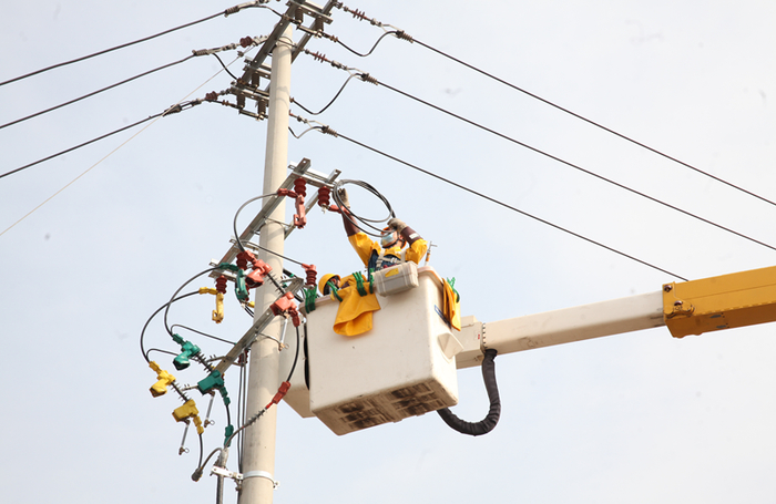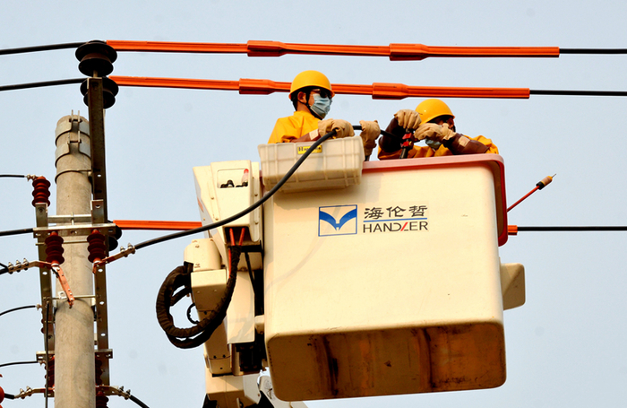 10月27日,山东淄博桓台供电公司带电作业班员工在10千伏莫王线前七支线4号杆上开展带电接火作业。(孙启涵)