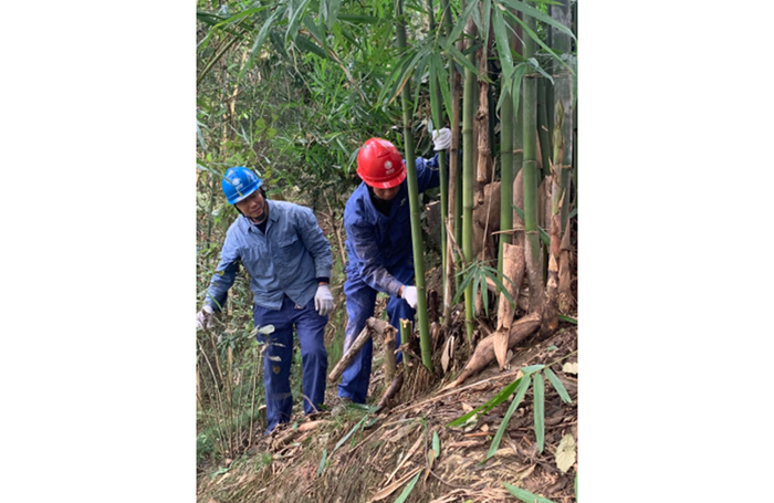 10月26日,四川宜宾江安供电公司员工车星楷、邱家洪清除10千伏井板线龙坝支线10~12号杆下的树障。(邓意红)