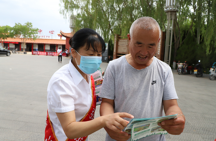 10月28日,甘肃酒泉玉门供电公司员工钟燕在玉泽湖公园向客户介绍安全用电知识。(范文婷)