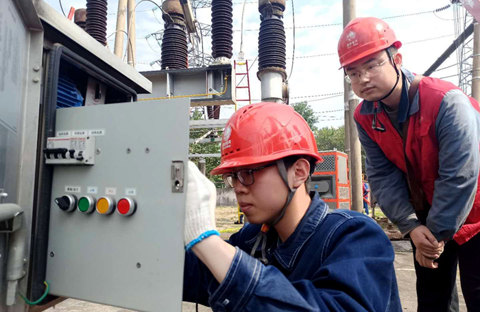 10月27日,湖南长沙供电公司员工在110千伏高塘岭变电站检修1号主变压器隔离开关。(尹柳)