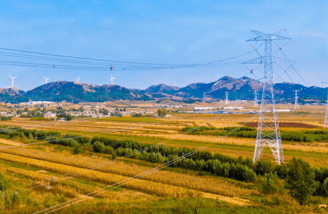10月27日,辽宁大连供电公司员工在500千伏登台输变电工程复州城段施工现场为3~5号塔架设导线。(王帅)