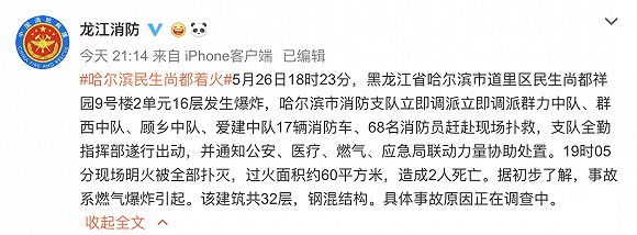 一小区居民楼16层因燃气泄漏发生爆炸继而引发火灾,造成2人死亡。