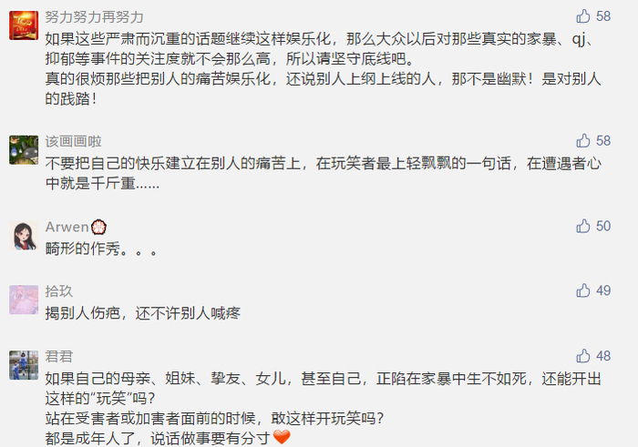 不是所有东西都可以拿来娱乐消费,不是什么玩笑都能乱开而没有后果。用戏谑的态度,对待极其恶劣严肃的事情,会给受害者造成更深的伤害,也会降低违法犯罪者的畏惧心。家暴从未停止,而毫无下限的娱乐消遣,无疑是在助纣为虐。