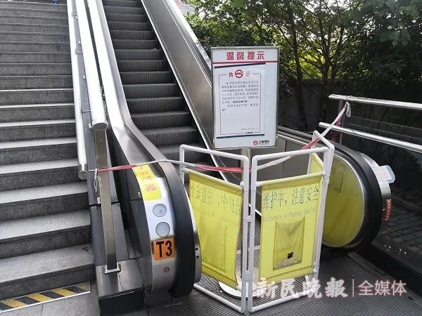 新民晚报记者来到轨交6号线巨峰路站。在现场,记者看到,巨峰路站有2个出入口,1号口电梯正常运行,2号口处有一部无障碍电梯和一部自动扶梯,全部“停摆”。地铁方用警戒线把自动扶梯围了起来,禁止乘客通行。市民马女士抱怨,此处的自动扶梯和无障碍电梯停运了3个月左右,一直没人来修,腿脚不便的中老年人只能走楼梯,实在吃不消。记者观察到,一些乘客不得不拎着大包小包,缓慢爬梯。还有推着婴儿车的市民,需要求助于车站工作人员。