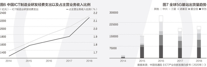 我国在ICT制造业的研发财力投入绝对值逐年增加,2018年同比增长14%;ICT制造业的研发经费支出占主营业务收入比重,从2014年的1.63%稳步提升至2018年的2.12%。