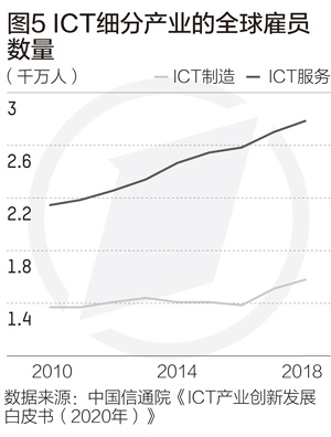 报告显示,ICT产业的发展带动全球ICT 就业人数逐年增加。欧洲委员会联合研究中心显示,2010年至2018年全球ICT雇员数增加834万人,2018年达到4366 万人。其中,ICT制造业全球雇员数复合年均增长率2%,ICT服务雇员数增长速度则明显高于ICT制造业,复合年均增长率达到3%,一定程度上反映出ICT服务业正在不断扩大产业规模,人才需求旺盛。