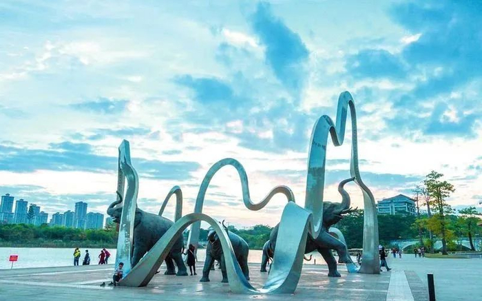 五象新区秋月路五象湖北广场,五头大象雕塑旁