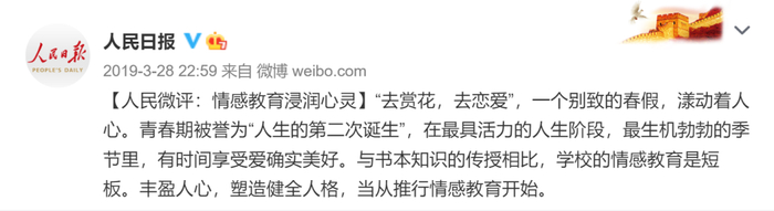 对此,人民日报评论称,“去赏花,去恋爱”,一个别致的春假,漾动着人心。青春期被誉为“人生的第二次诞生”,在最具活力的人生阶段,最生机勃勃的季节里,有时间享受爱确实美好。与书本知识的传授相比,学校的情感教育是短板。丰盈人心,塑造健全人格,当从推行情感教育开始。