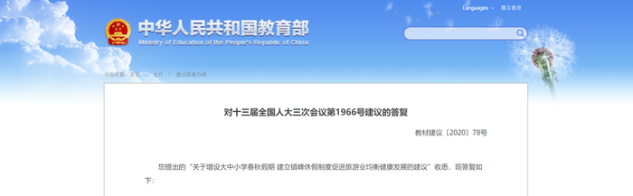 对此,教育部近日在官网公开答复称,在保证开足开齐国家规定课程,完成好正常教育教学任务和教学时长的前提下,学校放假时间包括春秋假时间由各地、高等学校结合实际做出具体安排。