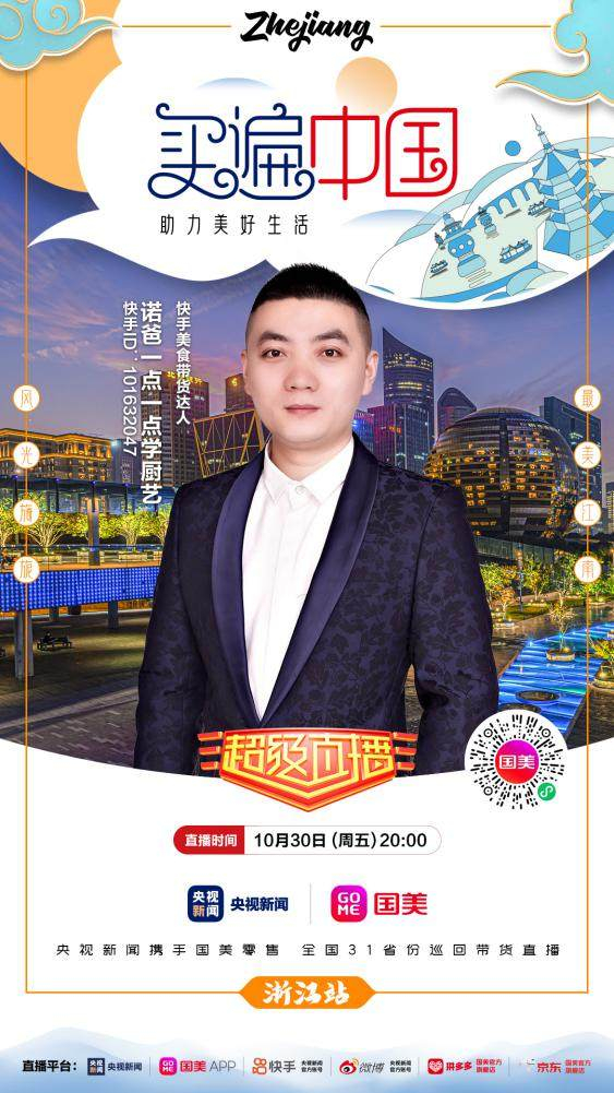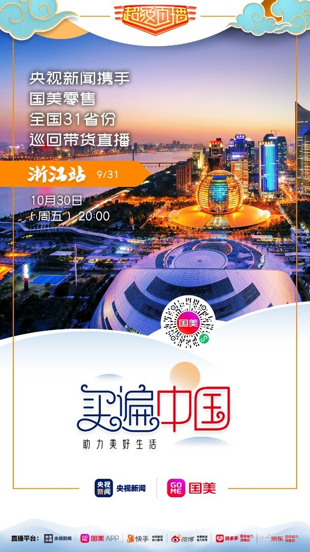 10月30日(周五)晚20点,锁定国美APP、京东国美官方旗舰店、拼多多国美官方旗舰店,及央视新闻客户端、央视新闻微博、央视新闻快手号,关注直播,组团看名主持聊段子,体验国美真选好货,品味江南味道。