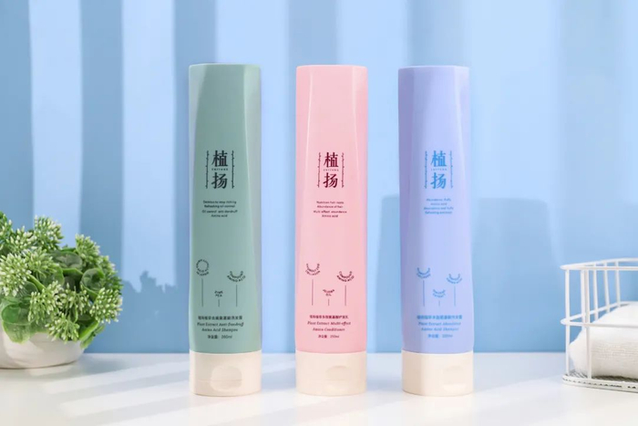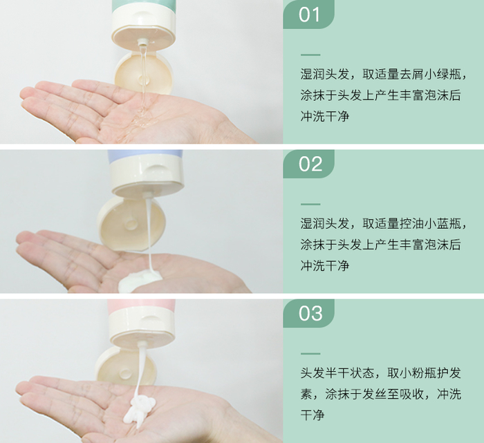 在洗头时先用绿、再用蓝,第三步再抹上粉瓶护发素。