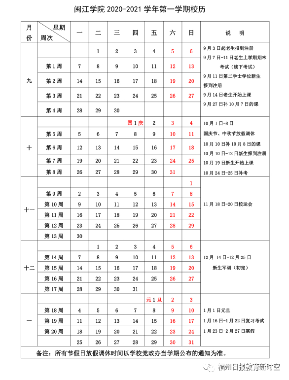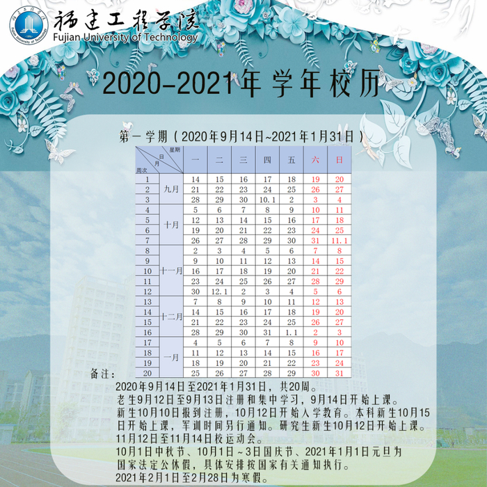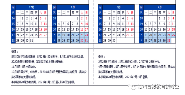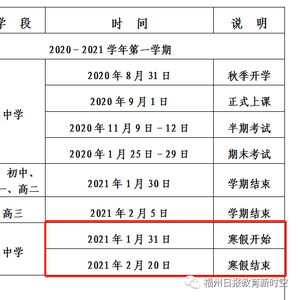 寒假:2021年1月30日开始(由于中秋国庆假期调整,寒假会相应再提前)。