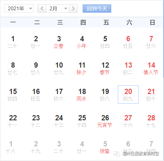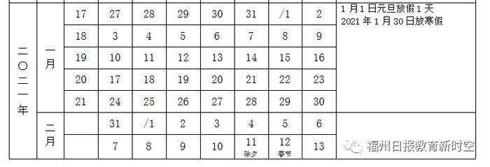 寒假:2021年1月28日—2月26日,共30天。