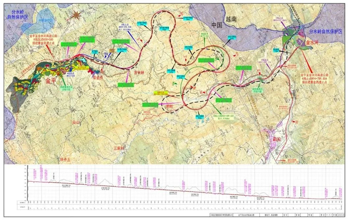 金金高速公路项目全线位于金平县境内,起于金平县城东侧,止于金水河镇金水河村,主线全长44.21公里,桥隧比高达86.32%,项目总投资93.1亿元,沿线计划设置2处互通及1个平面交叉。