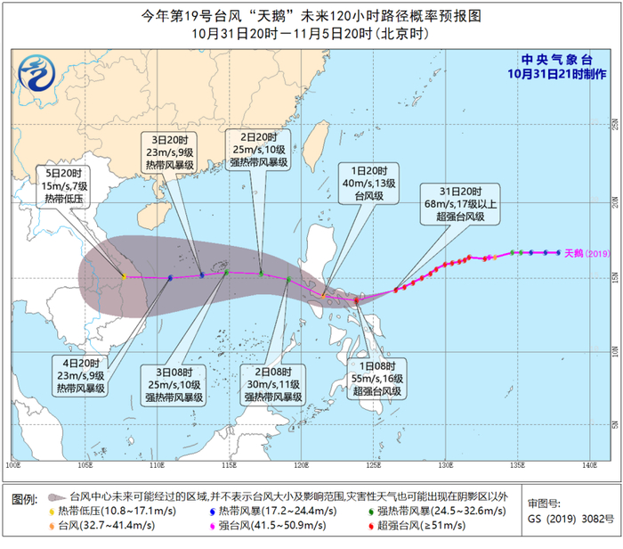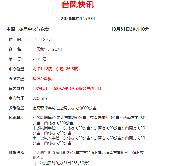 据中央气象台消息,31日17时,超强台风“天鹅”中心位于菲律宾马尼拉偏东方约660公里的西北太平洋洋面上,中心附近最大风力依旧维持在17级以上(68米/秒),中心最低气压为905百帕。预计,“天鹅”将以每小时25公里左右的速度向西偏南方向移动,强度变化不大,并将于11月1日白天在菲律宾吕宋岛东南部沿海登陆,之后穿过菲律宾吕宋岛,于11月2日进入我国南海海域。