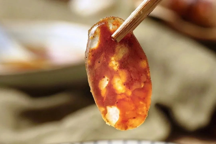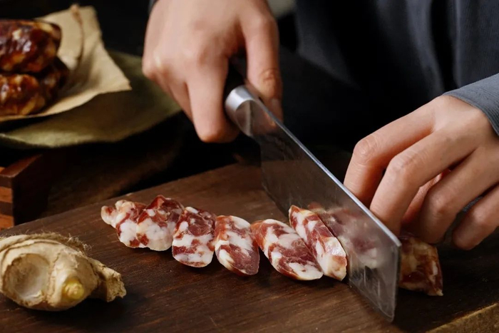 放在菜板上,小心翼翼的一刀切下去,香肠的汁液随着刀口渗下来,半透明的肥肉无规则的夹杂在暗红而又紧致的瘦肉里,一片片香肠显得格外诱人。