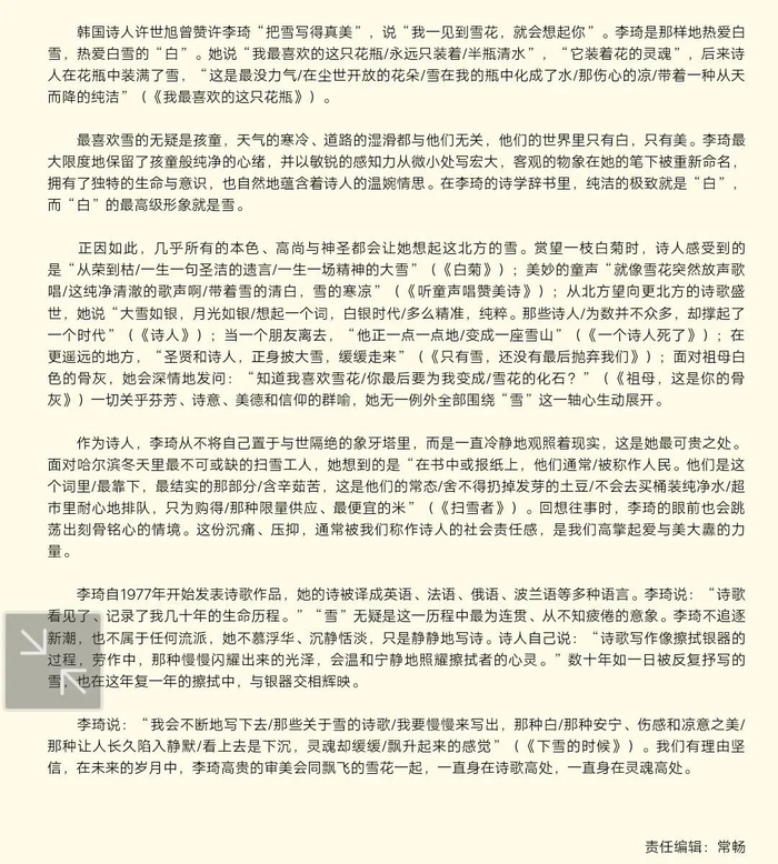 李琦自1977年开始发表诗歌作品,她的诗被译成英语、法语、俄语、波兰语等多种语言。李琦说“诗歌看见了、记录了我几十年的生命历程”,无需强调的是,“雪”是这一历程中最为连贯、从来不知疲倦的意象。李琦从不追逐新潮,也不属于任何流派,她不慕浮华、沉静恬淡,只是静静地写诗。诗人自己说:“诗歌写作像擦拭银器的过程,劳作中,那种慢慢闪耀出来的光泽,会温和宁静地照耀擦拭者的心灵。”数十年如一日被反复抒写的雪,也在这年复一年的擦拭中与银器相互辉映。